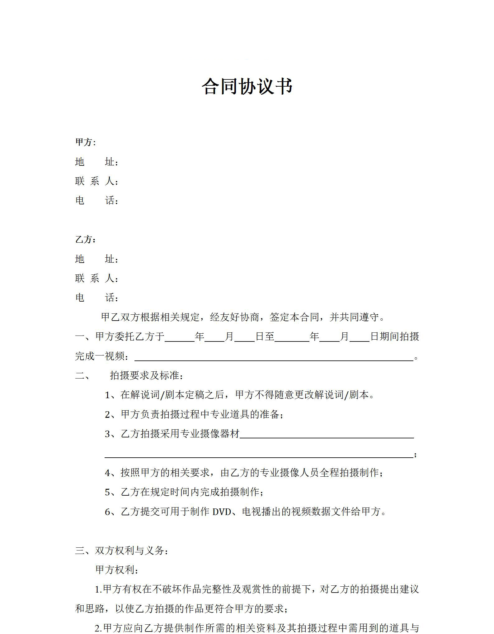 甲乙双方根据相关规定,经友好协商,签定本合同,并共同遵守。 一、甲方委托乙方于年月日至年月日期间拍摄完成一视频:。 二、 拍摄要求及标准: